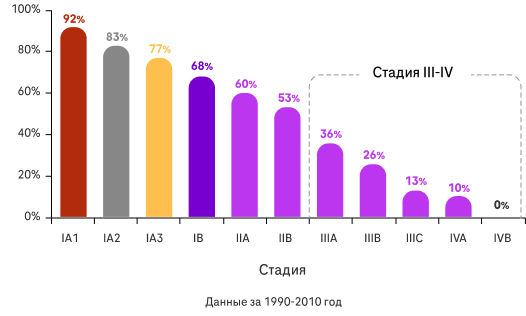 Выживаемость при раке лёгких коррелирует со стадией при постановке диагноза8