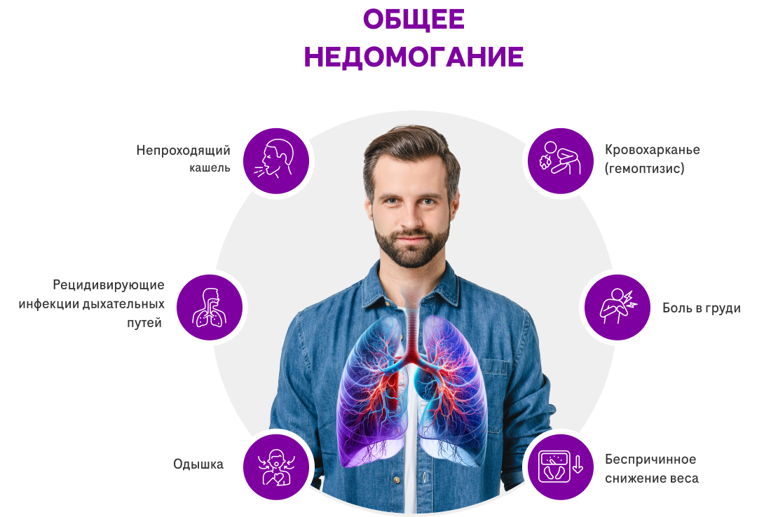 При раке лёгкого может наблюдаться ряд симптомов, указывающих на патологический процесс в лёгких9.
